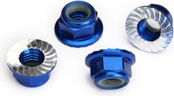 Náhradný diel pre RC modely áut 1:8 Traxxas Maxx, Desert Racer: Samoistná hliníková matica M5 s vrúbkovaným golierom modro eloxovaná. Balenie obsahuje 4 ks.