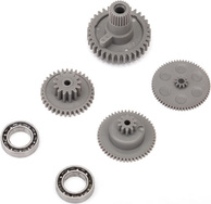 Plastové prevody štandardného serva Traxxas 2070/2075 pre RC autá a dvojice ložísk. Ozubené kolesá sú vyrobené z odolnejšieho materiálu a majú optimalizované rozmery pre maximálnu odolnosť.