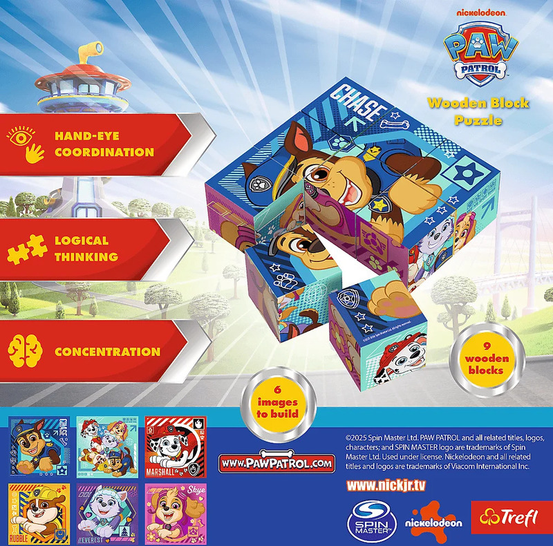 Ponorte sa do magického sveta Tlapkovej patroly z populárneho seriálu! Táto klasická drevená hračka s moderným nádychom je ideálna pre všetkých malých fanúšikov rozprávky, ktorí radi skladajú, porovnávajú a objavujú farebné ilustrácie svojich obľúbených postavičiek.