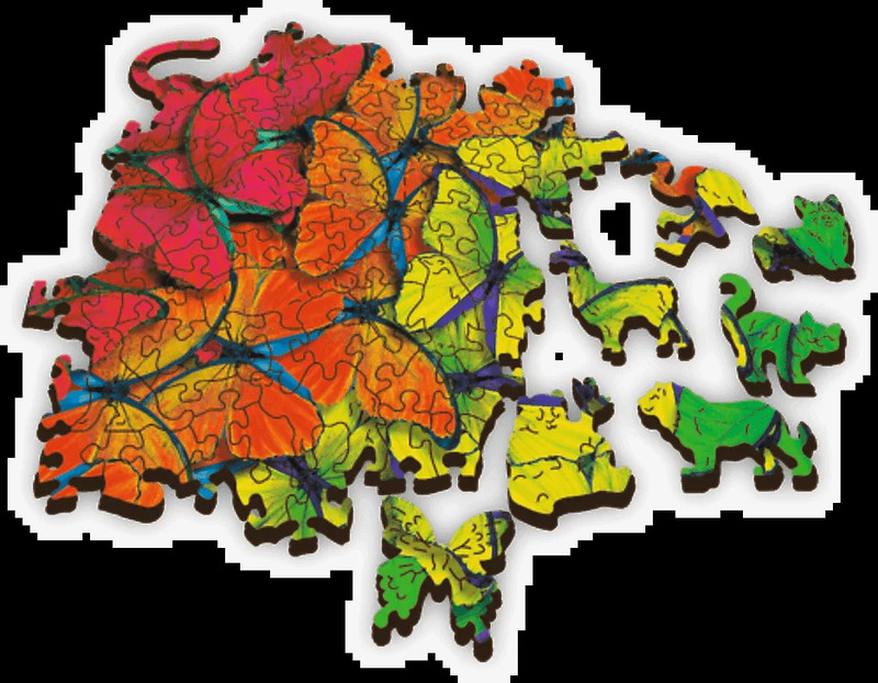 • Vysoká kvalita a precízne spracovanie laserom, až 50 unikátne tvarovaných dielikov, ostatné dieliky v nepravidelných tvaroch, puzzle je obojstranné – z jednej strany obrázok, z druhej strany vzor.