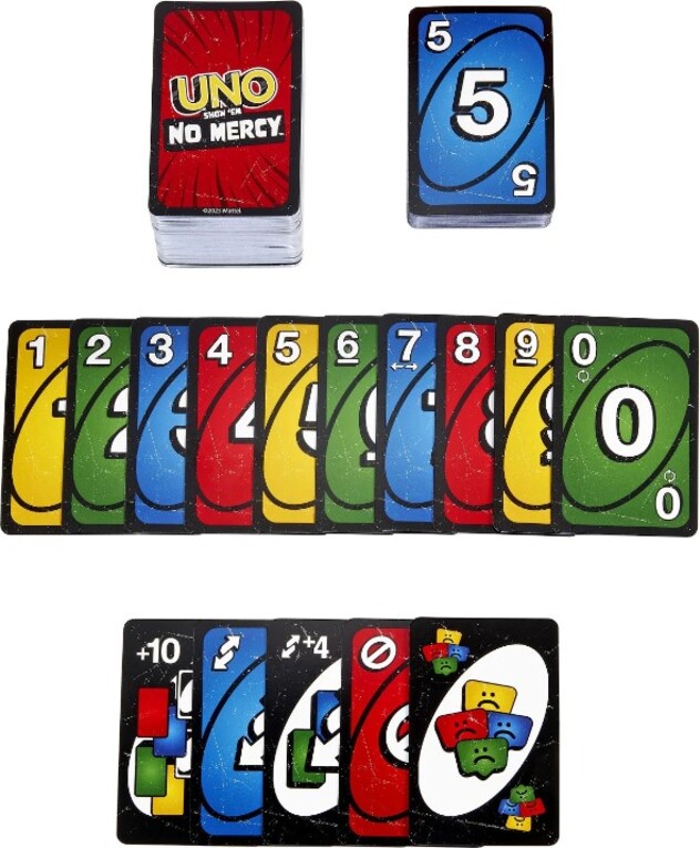 UNO Show Em No Mercy predstavuje nemilosrdnú verziu kartovej hry UNO. Obsahuje mnoho ďalších kariet s výrazne tvrdšími postihmi, ako je napríklad vziať si 10 kariet, aj nové pravidlá, vďaka ktorým budú hráči zbierať, vymieňať aj ťahať viac kariet ako kedykoľvek predtým. V hre môžete vyhrať dvoma spôsobmi, zbaviť sa všetkých kariet alebo vyradiť všetkých ostatných hráčov z hry. A pokiaľ nastane okamih, kedy budete mať v ruke len jednu kartu, nezabudnite zakričať UNO! Jedno je isté, kartová hra UNO Show Em No Mercy vás zaručene skvele zabaví.