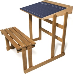 Krásny drevený školský stôl v tradičnom dizajne. Písacie plocha je obojstranná, z jednej strany na kriedy a z druhej na fixky. Lavice ukrýva aj veľký úložný priestor. Vyrobené vo Francúzsku. Dubová farba dreva.