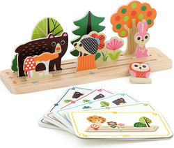 Pomocou drevených dielikov a hracích kariet s rôznou obtiažnosťou sa deti učia vnímať vzťahy medzi predmetmi – vľavo, vpravo, hore, dole, uprostred, a správne ich umiestniť podľa zadania. Dieťa pracuje samostatne alebo s pomocou rodiča, skladá podľa nápovedy z kariet a rozvíja tak koncentráciu, presnosť aj trpezlivosť. Drevené dieliky sa ľahko uchopujú, a tak hra prirodzene podporuje jemnú motoriku aj plánovanie pohybov.