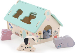 Domček v jemných farbách s motívmi kvetov má odnímateľnú strechu s tvarovanými otvormi na vkladanie zvieratiek. Jedná sa o ranú hračku inšpirovanú Montessori.