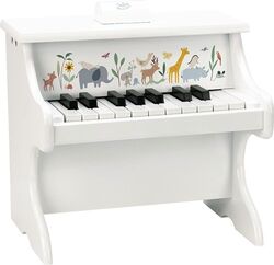Piáno je vyrobené z masívneho dreva, má veľkosť ideálnu pre malé ručičky a je dodávané s 10 notami, ktoré deti zoznámia so základmi hudby. Bez potreby elektroniky umožňuje vytvárať melódie, objavovať rytmus a zažívať radosť z hry. Hranie na klávesy navyše pomáha chápať vzťahy medzi akciou a zvukom, čo podporuje logické myslenie aj trpezlivosť. Piáno vydáva krásne zvuky a rozvíja vzťah k hudbe, ale nie je to profesionálny hudobný nástroj.