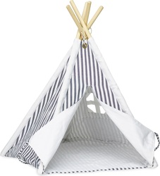 Krásne pruhované típí v mini prevedení, ideálne pre bábiky. Drevený základ s textilným prikrývkou je jednoduché zložiť. Textil je tmavo šedý a biely.