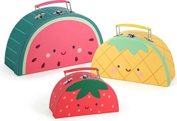 Súprava 3 kartónových kufríkov, ktoré sa dajú vložiť jeden do druhého, s ilustráciami šťavnatého ovocia - vodného melónu, ananásu a jahôd dizajnérky Sarah Betz podnecujú predstavivosť a pomáhajú rozvíjať jemnú motoriku.