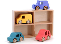 Autíčka sú vyrobené z masívneho dreva, čo zaručuje dlhú životnosť, a uložené v drevenej poličke, ktorá bude pekným doplnkom detskej izby alebo herne.