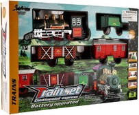 Balenie obsahuje: lokomotívu, ktoré svietia svetlá, 3 vagóniky, 6 ks zákrut a 2 ks rovných koľají. Na prevádzku sú potrebné 2 x AA batérie do mašinky (nie sú súčasťou).