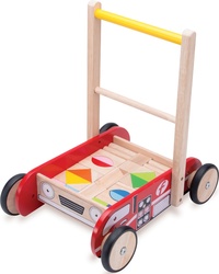 Chodítko v podobe hasičského vozidla obsahuje sadu kociek prevažne vo farbe prírodného dreva, prepravovať ním ale samozrejme je možné aj iné hračky. Snaha do neho kocky správne urovnať hru obohatí o skúšku dôvtipu.