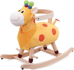 Je to plyšová žirafa s drevenou konštrukciou. Má madlá, opierky na nohy a tiež ochrannú opierku, čo je vhodné pre menšie deti. Až vaše deti povyrastú a budú si na hojdačke istejšie, môžete túto opierku na chrbát odstrániť.