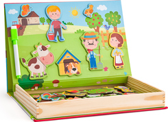 Drevená krabička je plná zvieratiek, ľudí, domčekov a ďalších prvkov s motívom farmárčenia. Každý motív sa navyše musí poskladať z viacerých častí. Dieťa ich umiestňuje na magnetické veko s obrázkom statku a lúky. Rozvíja tak kreativitu a jemnú motoriku.