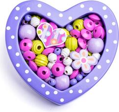 Táto sada obsahuje drevené korálky rôznych tvarov a farieb v praktickej drevenej krabičke v podobe srdiečka. Súčasťou sú aj tenké šnúrky s koncovkou k prevliekaniu.