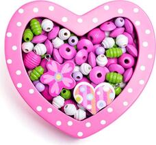 Táto sada obsahuje drevené korálky rôznych tvarov a farieb v praktickej drevenej krabičke v podobe srdiečka. Súčasťou sú aj tenké šnúrky s koncovkou k prevliekaniu.