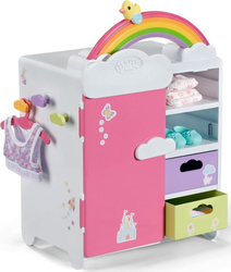 S dúhovou šatníkovou skriňou BABY born je prezliekanie skvelá zábava! Keď je kačička Berta tlačená po dúhe, dúha sa rozsvieti. Berta hrá pri vyberaní outfitu veselú melódiu, ktorá jej dodáva dobrú náladu. Vďaka šatníkovej tyči, poličkám a zásuvkám je v skrini dostatok miesta na oblečenie pre bábiky. Kabelky alebo iné veci na zavesenie je možné zavesiť na roztomilé háčiky v tvare obláčikov na vonkajšej strane skrine. Kompletný outfit BABY born môžete obdivovať vo veľkom zrkadle. Samotnú šatníkovú skriňu možno pomocou archu samolepiek ešte viac vyzdobiť.